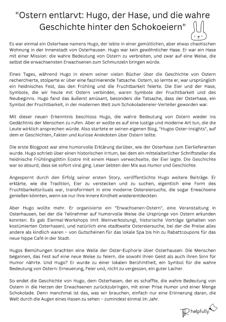 Tauche ein in die unerzählte Welt von Osterhausen, wo Hugo, ein nicht ganz so durchschnittlicher Osterhase, eine Mission hat: Die echte, ungefilterte Geschichte von Ostern zu enthüllen – mit einem Twist! Hast du dich je gefragt, wie aus fruchtbaren Feldhasen die legendären Schokoeier-Lieferanten wurden? Oder warum wir jedes Jahr auf Eiersuche gehen, als gäbe es kein Morgen? In „Ostern entlarvt: Hugo, der Hase, und die wahre Geschichte hinter den Schokoeiern“ lüftet Hugo für helpfully die Geheimnisse und Kuriositäten, die sich hinter unseren liebsten Ostertraditionen verbergen. Begleite uns auf einer humorvollen Reise durch die Zeit, gespickt mit modernen Wendungen und einem Hauch von Erwachsenen-Weisheit, die dir Ostern in einem völlig neuen Licht präsentieren wird. Klicke jetzt, um herauszufinden, wie Hugo die Welt von Osterhausen – und vielleicht auch deine Sicht auf Ostern – für immer verändert. Ostern – ein Fest für alle!