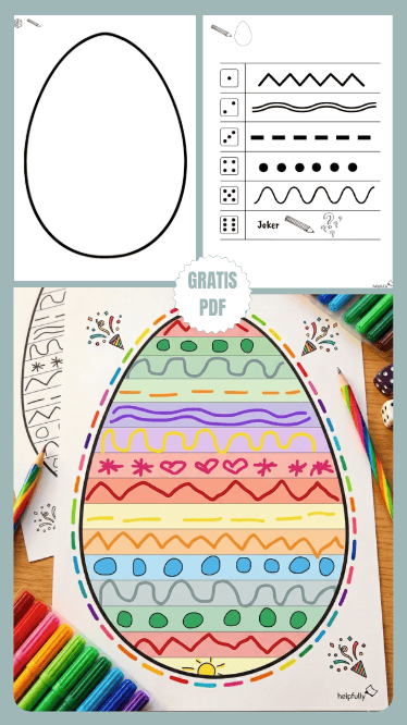 - Vorbereitung: Drucke die beiden Vorlagen aus. Du brauchst das große Osterei mit den Linien, die Legende mit den Würfelmustern, einen Würfel und natürlich deine buntesten Stifte.