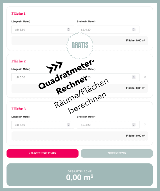 Quadratmeter berechnen klingt zwar erst mal nach „Mathe-Hausaufgaben“, aber spätestens beim Umzug, beim Bodenverlegen oder beim Kauf von neuer Deko für die Terrasse brauchen wir das alle mal! Unser Quadratmeterrechner berechnet dir Flächen schnell und einfach. Also, planst du gerade dein neues Wohnzimmer? Willst du wissen, wie viel Rollrasen in den Garten muss oder wie viel Wandfarbe du für das Schlafzimmer wirklich brauchst? Unser Online-Quadratmeterrechner ist dein smarter Begleiter für alle DIY-Projekte rund um Haus, Garten und Grundstück, wenn’s um m² geht!