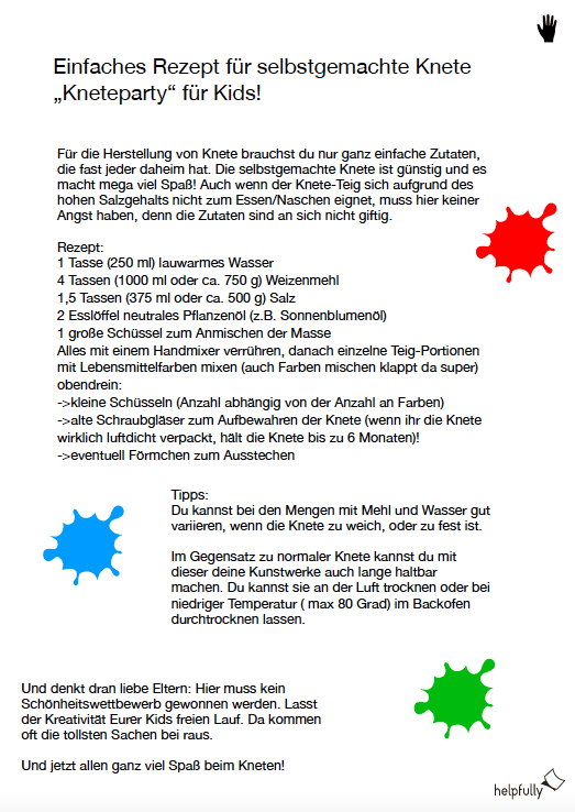 Kneten ist langweilig? Von wegen! Stundenlang können die Kinder hier ihrer Fantasie freien Lauf lassen und nach Herzenslust Motive gestalten (auch gerne mit Förmchen ausstechen). Wer Knete nicht kaufen, sondern selber machen will, kann unser Rezeptvorschlag ja ausprobieren! Wir würden uns mega freuen, wenn Ihr uns Bilder schicken würdet – damit wir den Knetspaß zum Rezeptvorschlag veröffentlich können…