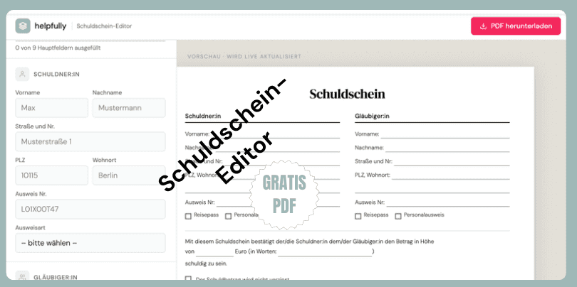 Geld leihen unter Freunden, in der Familie oder unter Bekannten – das klappt oft unkompliziert. Aber irgendwann oder in manchen Fällen fragt man sich: Haben wir das wirklich so ausgemacht? Wie hoch war die Summe wirklich, oder ist die Rückzahlungsfrist nah? Genau für solche Momente haben wir den Schuldschein-Editor auf helpfully.de gebaut.