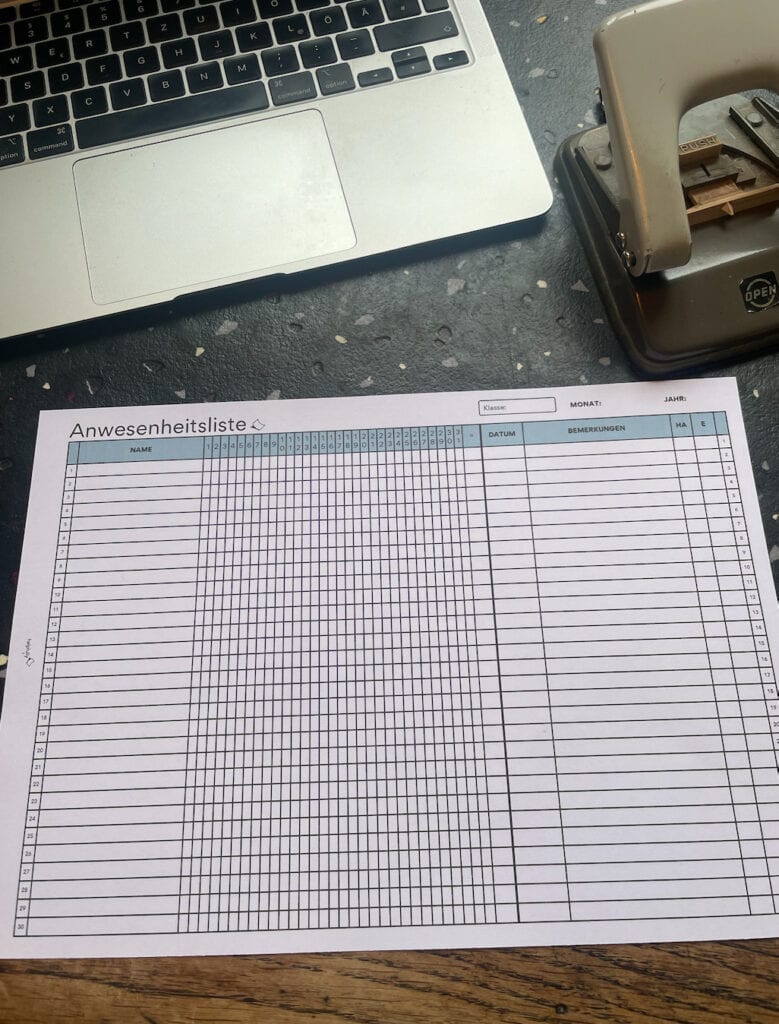 Einfach Anwesenheitsliste im A4 Querformat ausdrucken, mittig an der Markierung lochen und falten, in den Ordner einheften – fertig ist deine praktische Übersicht. Ob für Vertretungspläne, Klassenführung oder als Nachweis: Mit den Vorlagen von helpully bist du als Lehrer:in hoffentlich noch besser aufgestellt und machst dir dein Lehrersein leichter.