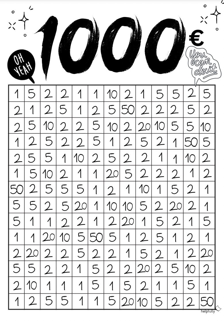 - Jedes Mal, wenn du ein paar Euros übrig hast – ob 1 €, 2 €, 5 €, 10 €, 20 € oder sogar 50 € –, machst du ein Kreuz in das entsprechende Feld und packst das Geld in ein Glas oder eine Dose.