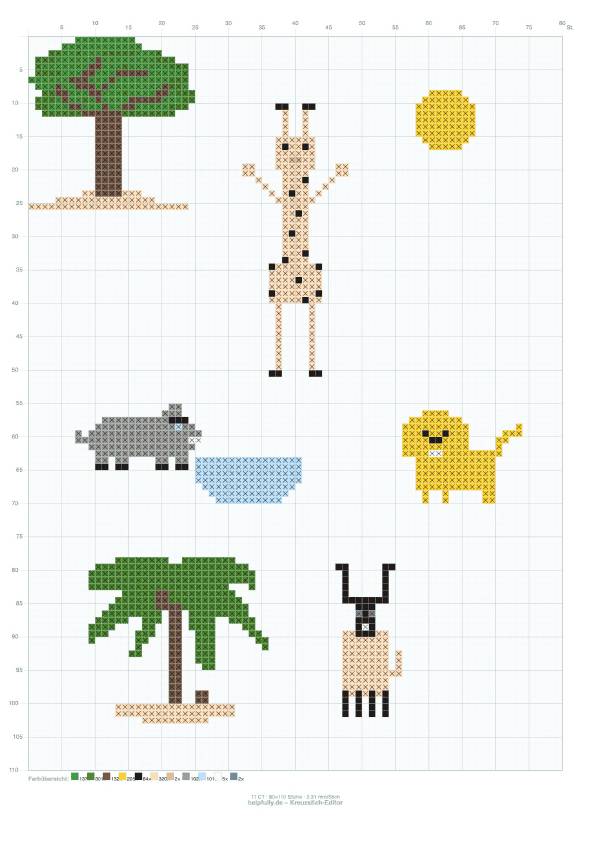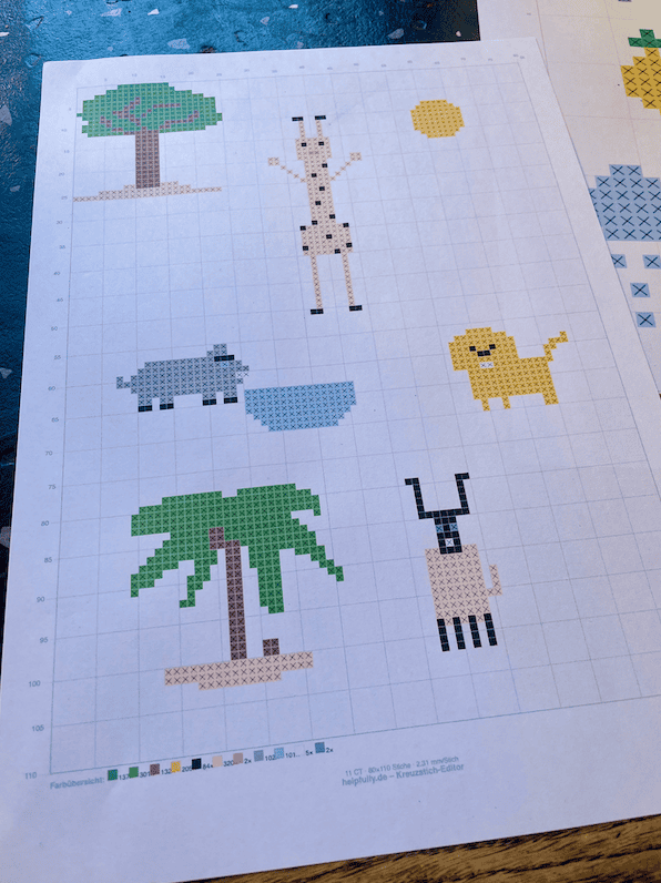 Klar, dass schon unsere kleinsten helpfullys den Kreuzstich-Editor ausprobieren wollen – und wir finden, es ist eine mega tolle Vorlage entstanden. Die Afrika-Tiere sind doch echt der Knaller, direkt zum Nachsticken, oder als Motivation, eigene Designs zu erstellen! Hier gestaltet mit 11 Counts, aber natürlich kann man die Stickvorlage auch für größere Zählstoffe verwenden – Hauptsache die Handarbeiten machen Spaß. Gestickt sehen die Afrika-Stickereien mega toll aus, finden wir. Also, ran an die Gratis-Vorlage und loslegen, natürlich gerne mit Hilfe von großen Handarbeitfans!