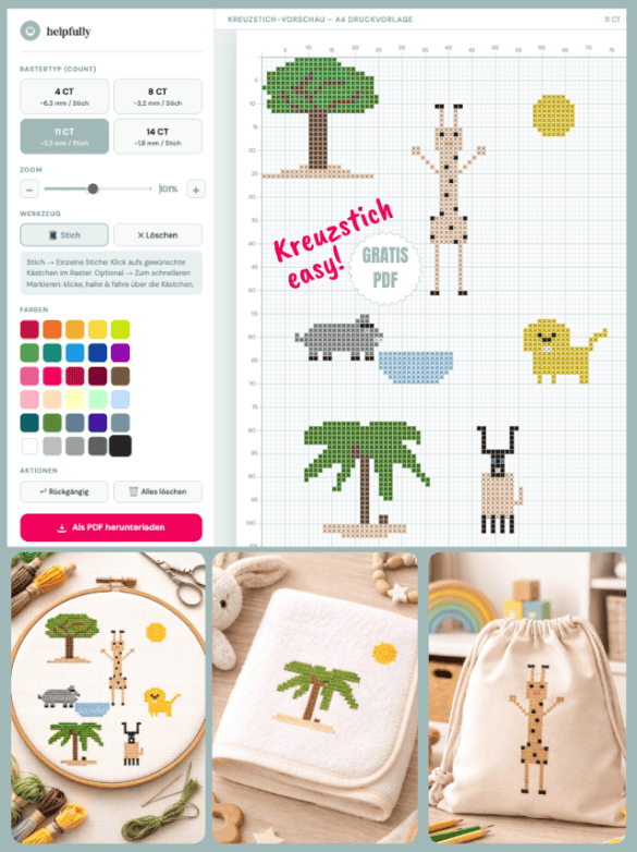 Klar, dass schon unsere kleinsten helpfullys den Kreuzstich-Editor ausprobieren wollen – und wir finden, es ist eine mega tolle Vorlage entstanden. Die Afrika-Tiere sind doch echt der Knaller, direkt zum Nachsticken, oder als Motivation, eigene Designs zu erstellen! Hier gestaltet mit 11 Counts, aber natürlich kann man die Stickvorlage auch für größere Zählstoffe verwenden – Hauptsache die Handarbeiten machen Spaß. Gestickt sehen die Afrika-Stickereien mega toll aus, finden wir. Also, ran an die Gratis-Vorlage und loslegen, natürlich gerne mit Hilfe von großen Handarbeitfans!