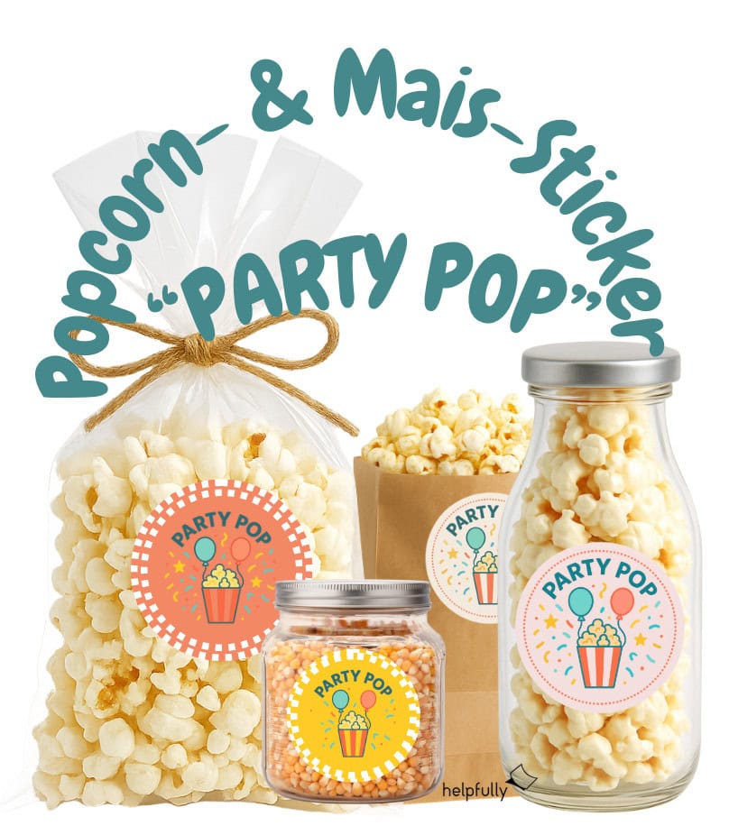 Ob süßes Popcorn, knuspriger Mais oder kleine Mitgebsel: Mit unseren „PARTY POP“-Stickern bringst du sofort Partystimmung in jede Tüte, Flasche oder jedes Glas! Die Etiketten in fröhlichen Farben passen perfekt zu Geburtstagen, Kinderfesten, Halloween, Hochzeiten, Babyshower, Pyjama-Partys, Movie Nights oder einfach zum „Nur-so-Verschenken“.