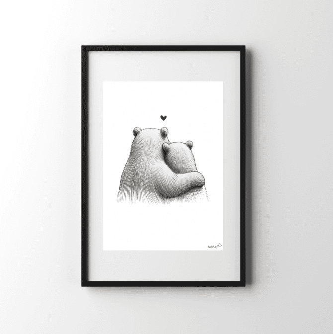 Eine extra Portion Bärenliebe gesucht? Unser Bärenpaar zeigt sich von hinten, dicht aneinander gekuschelt, und mitten in ihrer Umarmung prangt ein kleines Herz, das ihre Zuneigung perfekt in Szene setzt. Diese beiden knuddeligen Riesen sind das ideale Motiv für alle, die es gerne gemütlich und herzerwärmend haben. Ob als Geschenk zum Valentinstag oder als süße Dekoidee und Liebesbotschaft für zwischendurch – das Tierposter bringt bärige Romantik ins Zuhause!