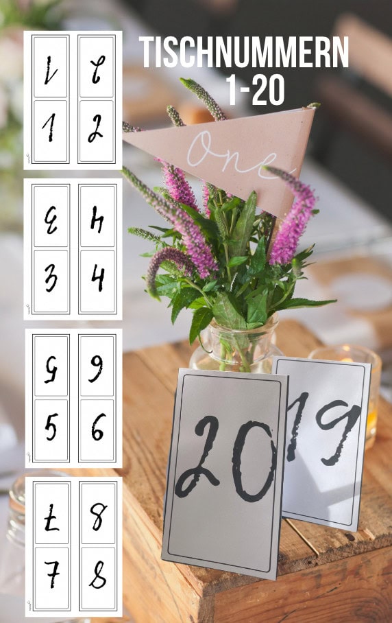 - je nachdem, wie viele Personen an dem Tisch sitzen und wie groß dieser ist, kannst du die Tischnummern natürlich auch mehrfach ausdrucken und gerne noch gestalten! Glitzer, Blumen, Herzen, Willkommen? Du entscheidest!