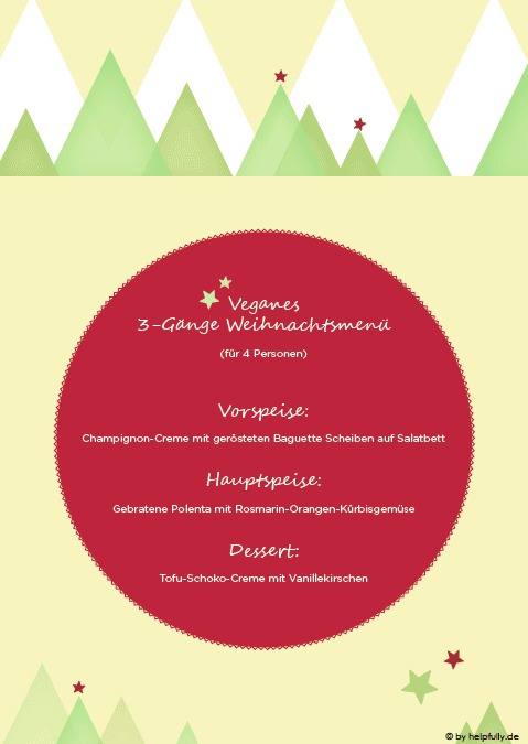 Zugegeben, ich bin etwas skeptisch, wenn es um die Vegane Küche geht. Dennoch bin ich begeistert von dem Rezept, was sich unsere Grafikerin für den Weihnachtsabend ausgedacht und in so einer schönen Form für die festliche Tafel vorbereitet hat ♥ Also ausrucken, einkaufen, an den Herd stellen, Liebsten einladen und genießen…Wir wünschen einen Guten Appetit!