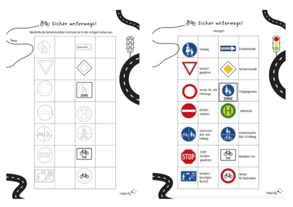 Die Fahrradprüfung steht an, oder die Kinder radeln mit dem Bike in die Schule? Dann ist es doppelt wichtig, die Verkehrzeichen und Straßenschilder zu kennen. Die 2-seitige Vorlage ist so gestaltet, dass die Kids auf der ersten Seite die Zeichen als Arbeitsblatt selbst beschriften und die Schilder ausmalen sollen. Die zweite Seite der Übung zeigt die Lösungen an, falls man mal lubschen muss… Du kannst die kostenlose PDF-Vorlagen ganz einfach downloaden, ausdrucken und schon kann’s losgehen mit den Übungen der Verkehrsschilder!