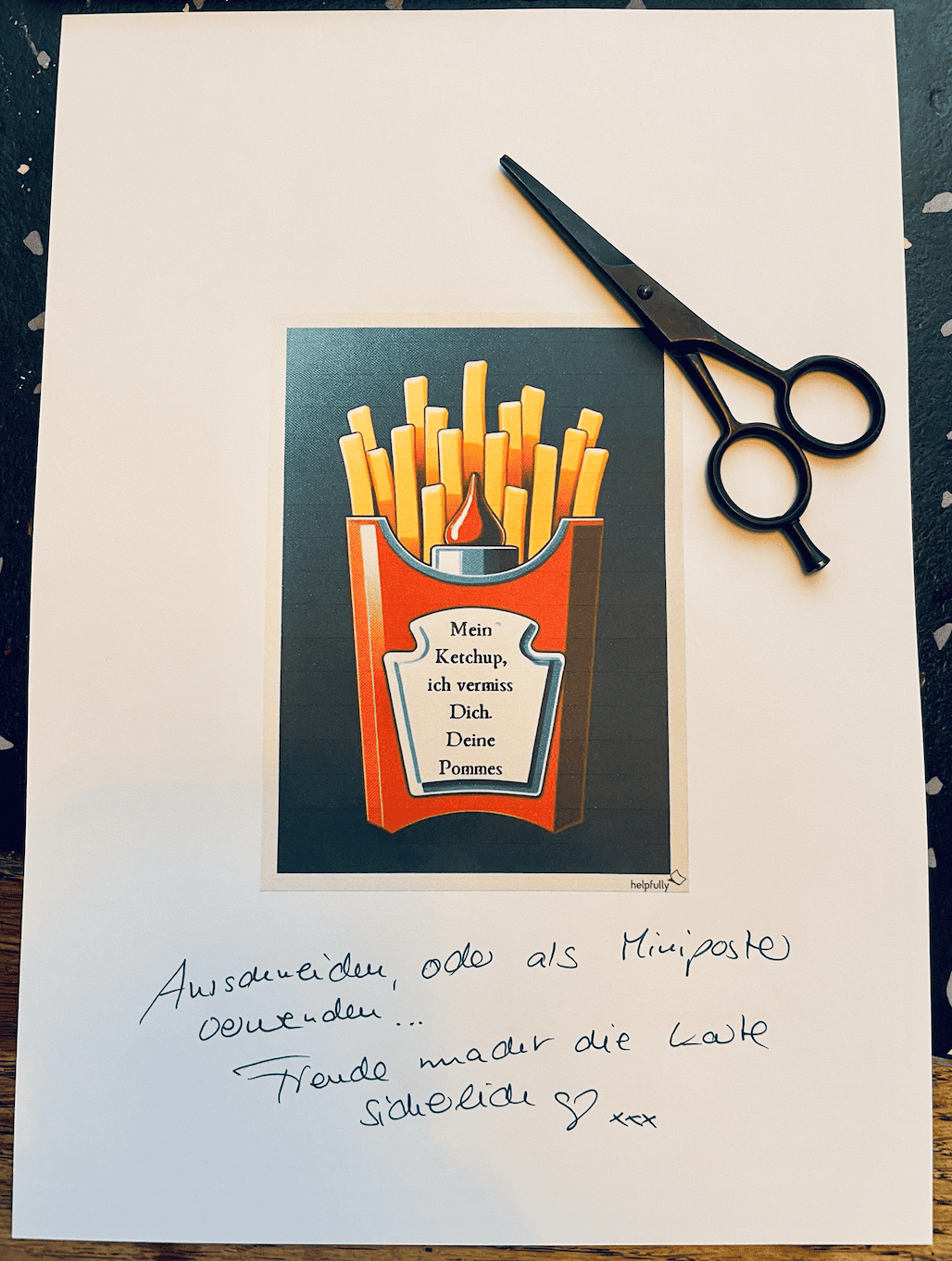 Hast Du auch einen Ketchup oder eine Pommes, die Du vermisst? Dann ist die Vermiss-Dich bzw. Miss you Karte von helpfully zum Ausdrucken vielleicht genau Deins! Wir haben die Karte(n) im Retrodesign mit Liebe erstellt und hoffen, dass sie Dir und Deinen Liebsten genauso gut gefällt und vor allem die Wartezeit etwas versüßt… Die Postkarten haben ein Format von ca. 10 x 14 cm. Du kannst das A4 also ausdrucken, die Karte ausscheiden, oder auch im Gesamten als Miniposter verwenden.