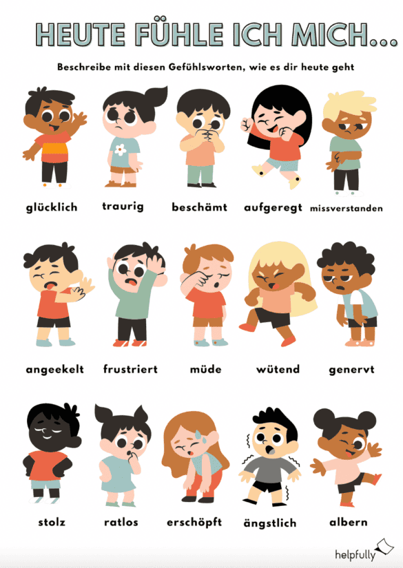 Gefühle benennen – für manche Kinder das Einfachste der Welt, für andere massiv schwer. Wir haben das Arbeitsblatt „Heute fühle ich mich….“ als A4-Vorlage zum Ausdrucken erstellt, da es für uns echt wichtig ist über Gefühle zu reden und zu sehen wie es bei den Kids „innen“ aussieht, oder das sie verstehen, wie sich ihr Gegenüber vielleicht gerade fühlt… Die Vorlage zeigt verschiedene Kinder und deren Gefühlsregungen, sei es durch einen Gesichtsausdruck oder eine Geste.