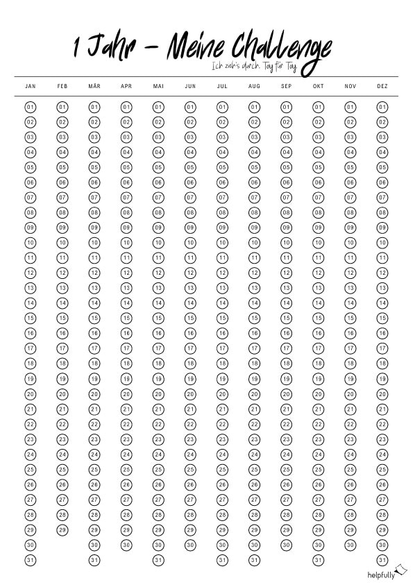 Die Monate von Januar bis Dezember stehen oben, darunter warten alle Tage des Jahres auf ihre Markierung. Du kannst abhaken, ausmalen, Punkte setzen, Sticker kleben – Hauptsache, du feierst jedes kleine „Ich hab’s heute geschafft“. Startdatum? Such dir einfach den nächsten Tag aus und leg los. Die Challenge funktioniert für Vorsätze und neue Gewohnheiten im Januar genauso wie im Juni oder irgendwann mittendrin. Für Februar alle Jahre nutzbar, da Februar 28 oder 29 Tage hat.
