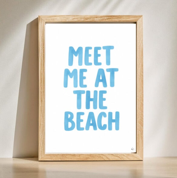 Bring instant summer vibes to your walls with this stylish MEET ME AT THE BEACH poster in a breezy ocean-blue hue. Perfect for anyone dreaming of salty air, sandy toes, and that laid-back coastal life.