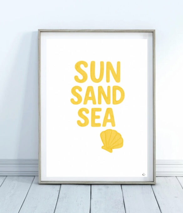 Bring endless summer vibes into your space with this sunny, feel-good wall art! The bold SUN SAND SEA lettering in bright, beachy yellow and the sweet seashell detail instantly transport you to warm days, salty hair, and barefoot adventures. This printable is perfect for anyone who lives for sunshine, sandy toes, and ocean breezes. Print it at home in just a few clicks, pop it in a simple A4 frame, and boom—you’ve got instant summer on your wall.