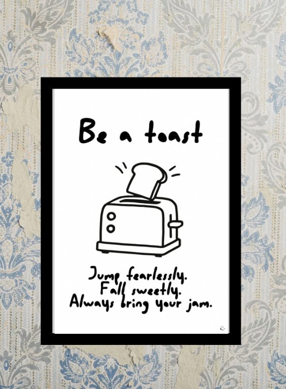 Be a toast. Das Poster ist eine kleine Erinnerung daran, das Leben mit einer ordentlichen Portion Leichtigkeit, Humor und… Marmelade zu nehmen. Ob als Wandbild für die Küche, das Büro oder als Geschenk für Lieblingsmenschen – „Be a toast. Jump fearlessly. Fall sweetly. Always bring your jam.“ bringt genau die Energie mit, die wir alle manchmal brauchen: Mut zum Springen, Gelassenheit beim Hinfallen – und das Wissen, dass man mit Marmelade (im übertragenen oder wörtlichen Sinne) irgendwie immer wieder obenauf landet, selbst wenn mal wieder alles schief läuft!