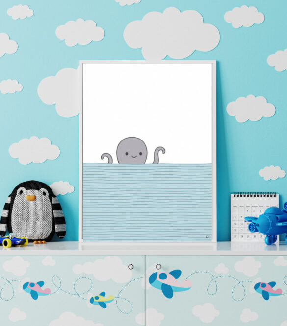 Achtung, Achtarme voraus! Die zuckersüße Krake winkt fröhlich über die Wasserlinie und bringt garantiert gute Laune mit sich. Ob im Babyzimmer, Kinderbad, in der Kita oder sogar auf der Kinderstation: Das freundliche Tentakelwesen sorgt überall für ein herzliches Lächeln.