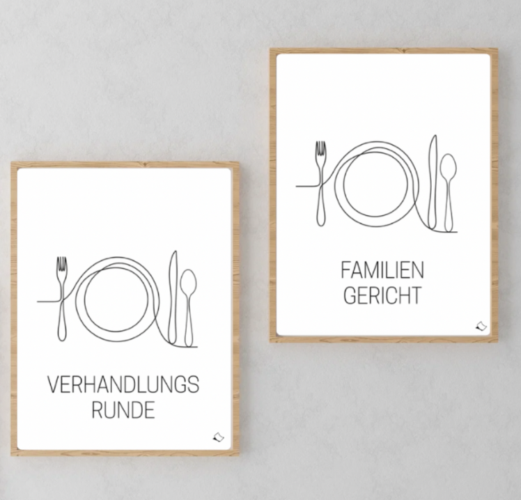 Ob zuhause beim Abendessen oder im Büro beim Lunch – hier wird nicht nur gegessen, sondern auch taktvoll verhandelt. Unsere minimalistischen Wandbilder „Verhandlungsrunde“ und „Familiengericht“ bringen auf charmante Weise auf den Punkt, was am Tisch wirklich passiert: eine Prise Diplomatie, eine Extraportion Chaos und hoffentlich ganz viel Herz, Humor und Hunger.