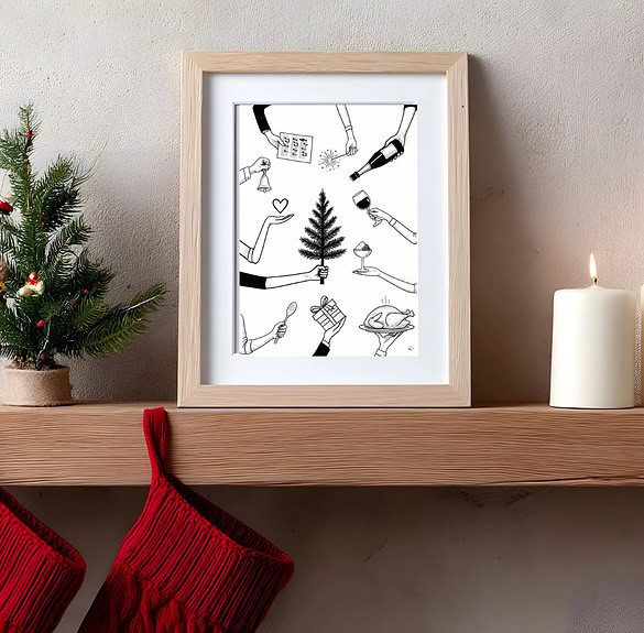 Minimaler Aufwand, maximal Xmas! „Hände voller Weihnachten“ – hier kommt euer kleines Fest für die Wand! Das A4 Poster von helpfully mischt Tanne, Glocke, Dessertlöffel, Wein und ein Funken Wunderkerzen zu einem cleanen, modernen Motiv, das sofort Stimmung macht. On Top die Liebe, denn chaoisch wird’s doch immer (: A4 ausdrucken, in den Rahmen stecken (mit oder ohne Passepartout) oder mit Masking Tape an die Wand – fertig ist die ruckzuck-Deko für Wohnzimmer, Kaminboard, Flur oder Küche.