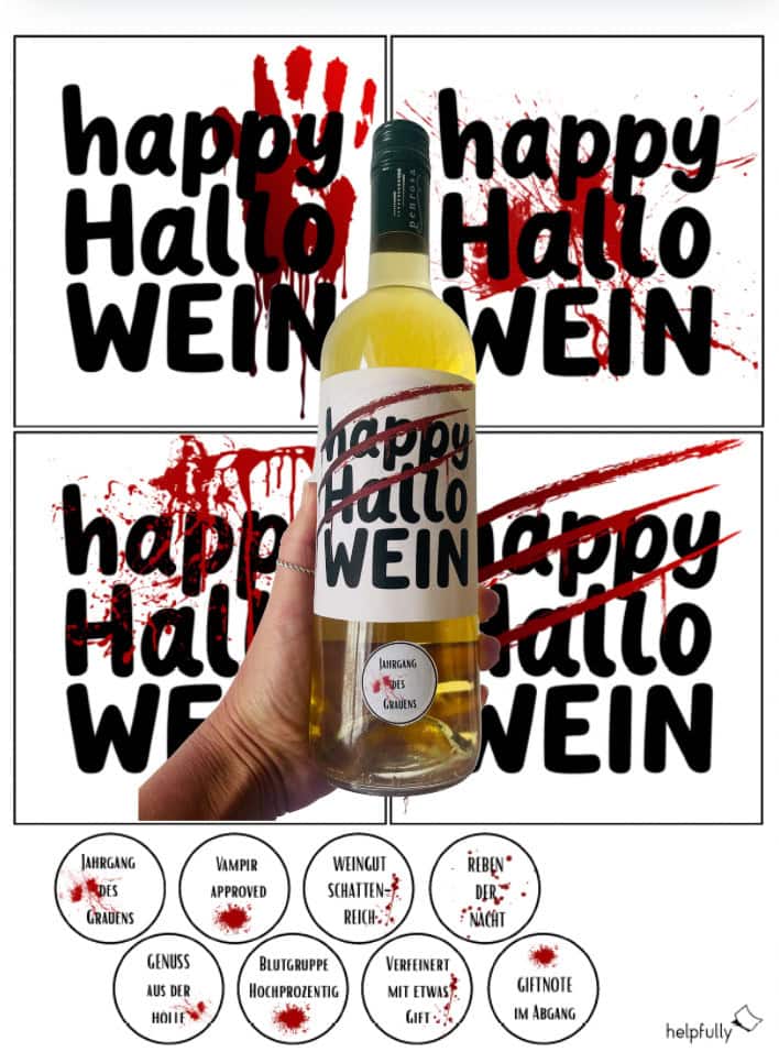 Die Vorlage enthält vier „Happy Hallo WEIN“-Designs, von blutiger Handabdruck-Optik bis zur dreifach gekratzten Horror-Edition – da ist für jeden Vampirgeschmack was dabei. Noch besser: Die kleinen runden Mini-Sticker mit genialen Sprüchen wie „Blutgruppe hochprozentig“, „Vampir approved“ oder „Weingut Schattenreich“ sorgen für das gewisse Extra.