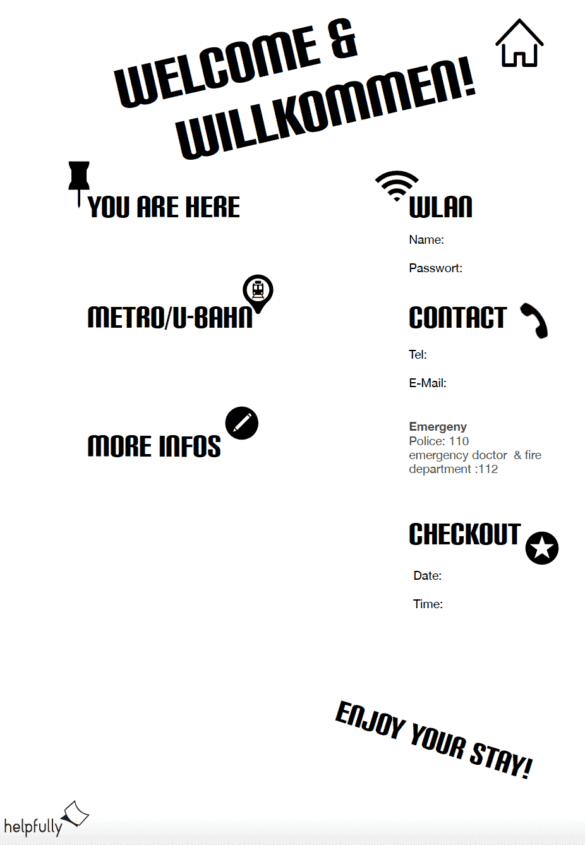 Ferienwohnung, airbnb, Zimmer auf Zeit: Das Info-Willkommensschild „Welcome“ ist schnell ausgedruckt und wird mit ein paar Infos rund um Standort, WLAN, nächste U-Bahn, Checkout und Co zum guten Kurzüberblick für Gäste. Selbstverständlich kannst Du auch ein eigenes Schild erstellen, aber für die Last-Minute Buchung, eine kurzzeitige Vermietung und allen nicht-so-digis hilft die Blanko-Vorlage zum Ausfüllen sicherlich weiter!