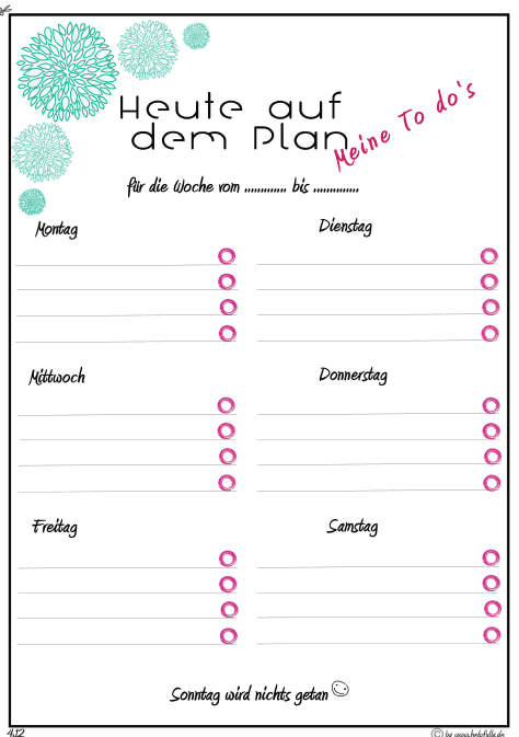 Der Wochenplan zum Ausdrucken wird nicht Deine To Do’s für Dich erledigen, leider nein. ABER, und das ist der entscheidende Punkt – er macht es Dir leichter Dinge nicht zu vergessen. Also, Liste ausdrucken, ausfüllen, erledigen und dann endlich den langersehnten Haken dran machen ♥