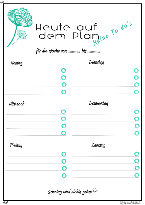 Dies, das und noch jenes… Ja, wir kennen die Wochen-To-Do’s nur zu gut, die sich gerne mal verschleppen oder vergessen gehen. Probier’s mal mit dem Wochenplaner zum Ausdrucken, denn dann hast Du’s direkt vor Augen. Ausfüllen, erledigen und Haken dran machen – ein echt gutes Gefühl!