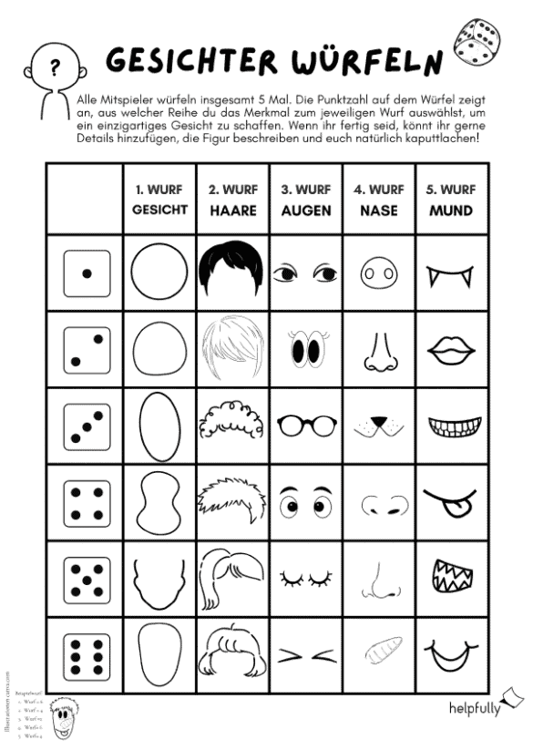 Viel Spaß beim Gesichter-Würfelspaß! Lassen Sie Ihrer Kreativität freien Lauf und bereiten Sie sich darauf vor, über die humorvollen Gesichter, die entstehen, zu lachen.
